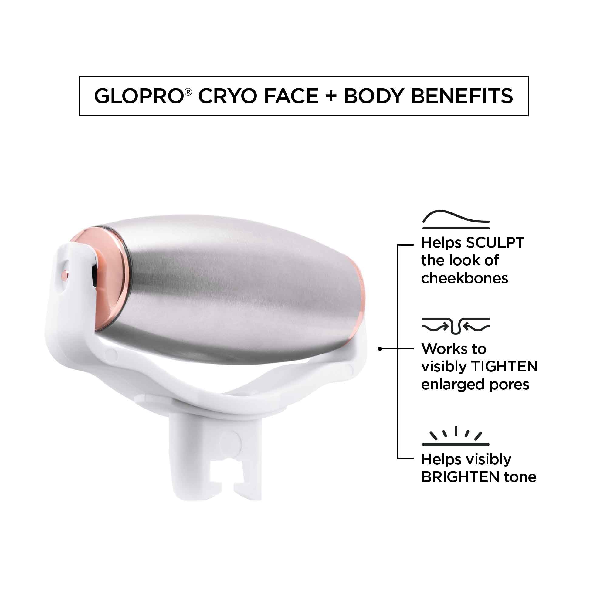 Professional-grade stainless steel, GloPRO® cryo roller attachments for the face and body harness the natural power of ice-cold temps to help visibly depuff, tighten and detoxify skin for a radiant, clearer-looking, and more sculpted appearance. Please note, this item only includes the GloPRO® Attachments and the full GloPRO® Tool is not included.