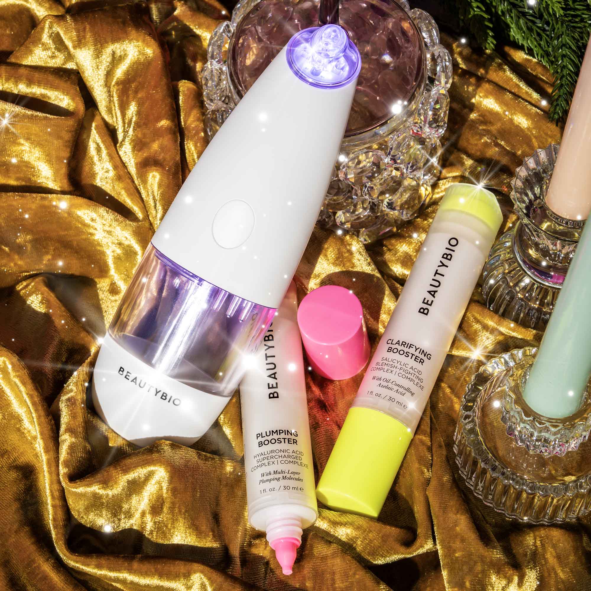 Your pores’ new party crew. This glow-giving bundle pairs the patented, award-winning GLOfacial hydration facial tool with two of its perfect serum sidekicks for skin that looks clean, hydrated, and radiant. Choose The Plumping Booster for bouncy, hydrated results or The Clarifying Booster for visibly balanced, refined skin. Together, they deliver your best glow yet – whether it’s for you or your bestie.